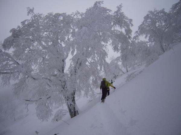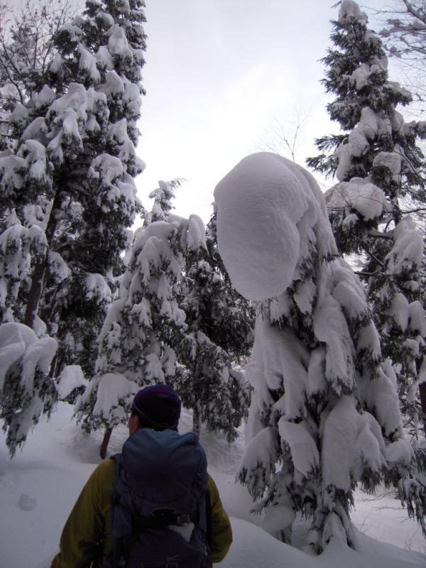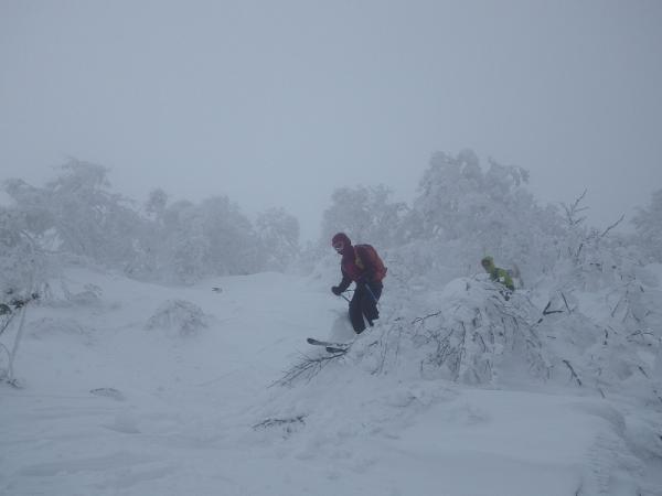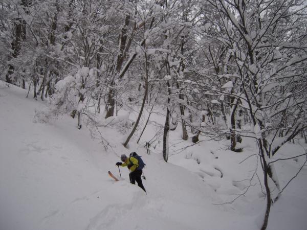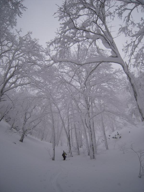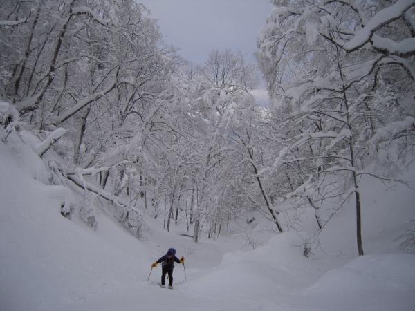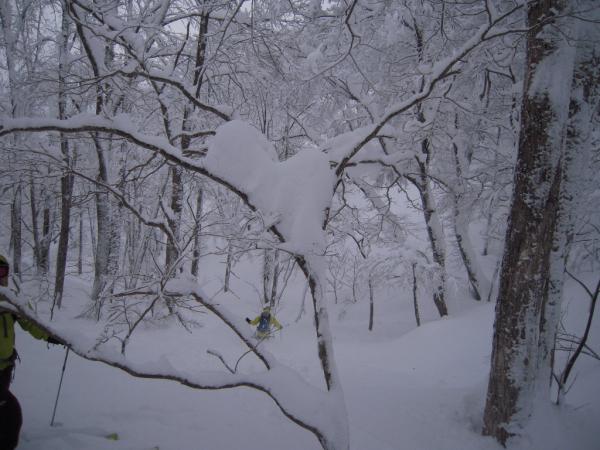樹林帯をトラバースしながら下るときにはお決まり通り頭から新雪に突っ込んで雪まみれになりました。