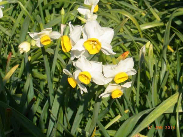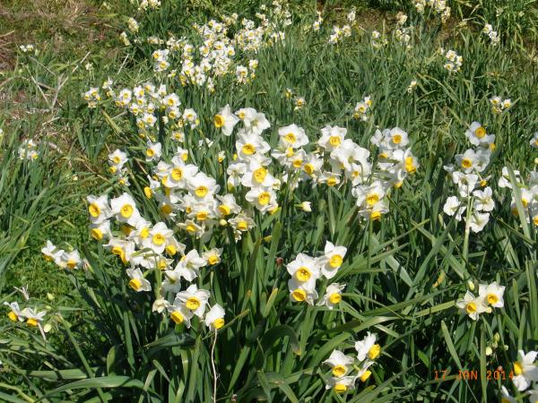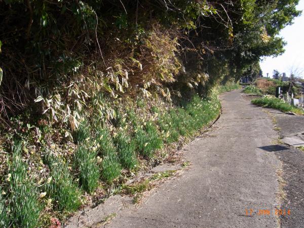 登山道に入る福満寺まで、あたたかくのんびりとした道路を歩いて行くと、道端にスイセンが咲いているのが目に入ります。このあたりでは安房勝山や保田のスイセンロードが有名ですが、駅からの普通の道端にもたくさんのスイセンが咲き乱れていて感心しました。あたたかい陽射しを浴びてほのかな春の香りを漂わせるスイセンは、まっすぐに伸び凛として、昭和初期の女性のようなすがすがしい美しさです。