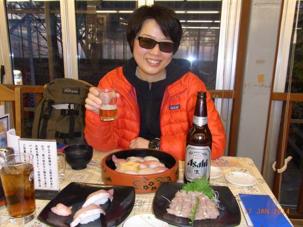 風呂あがりに海に落ちる夕日とかもめを眺め、ちょっと旅行気分。このまま民宿に泊まってだらだら飲みながら浴衣で畳の上に寝そべりたい・・・と思いながら食事処へ。