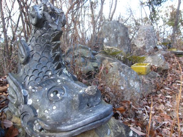 道の隅に屋根に使われている瓦の守り神が。魚?河童?鬼?いろいろありました。