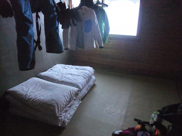 歩いてるときは暖かかったので上記のウエアで十分でしたが、小屋の中は寒く防寒着が必要でした。