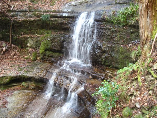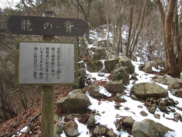 - ネイチャーパーク笠形山駐車場(20分)竜ヶ滝登山道入り口(10分)勝負滝(5分)龍ヶ滝(5分)熊の段(5分)登山口(20分)天邪鬼の力水(25分)山頂まで30分看板(10分)龍の背(15分)山頂