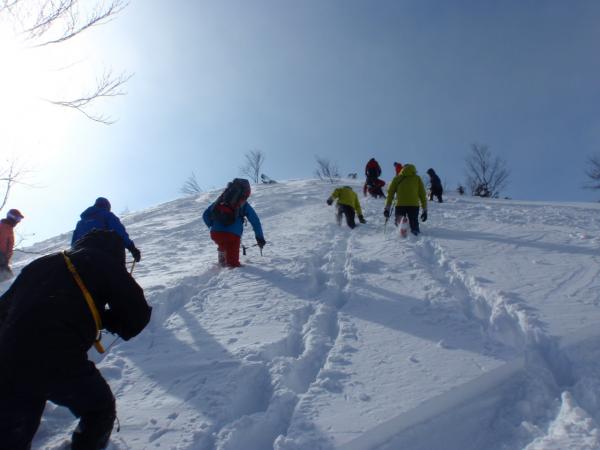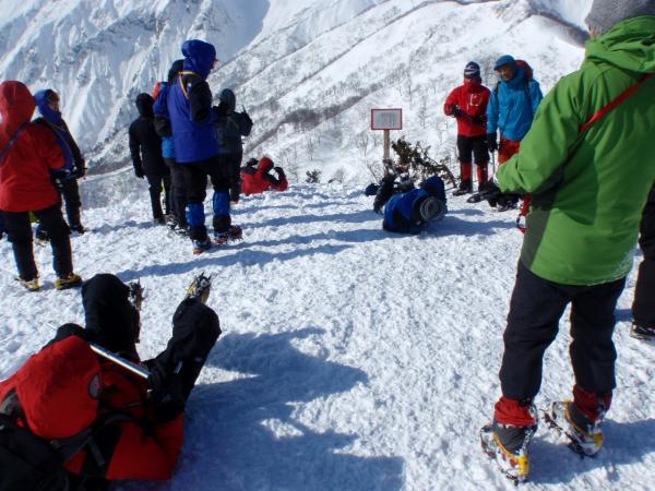 雪の状態がわりと柔らかかったので、アイゼン歩行の感覚や滑落停止の練習は実感がわきにくい部分もあったかと思いますが、みなさん自分でイメージしながら熱心に練習されていました。