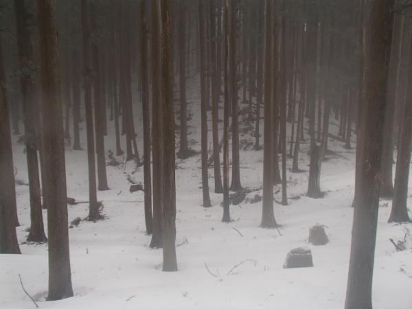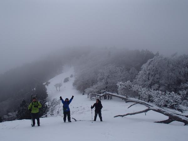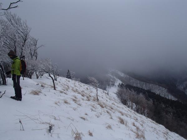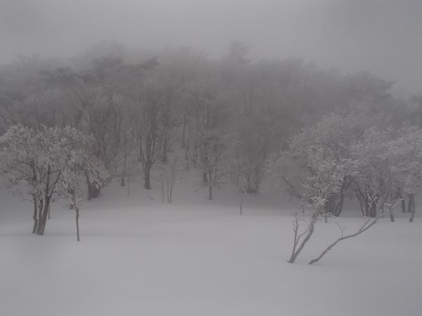 木梶山から馬駆ヶ辻の稜線は展望が開け最高の景色でした・・・と書きたいところですが、相変わらずの雨男。雪雲に覆われ展望はありませんでした。