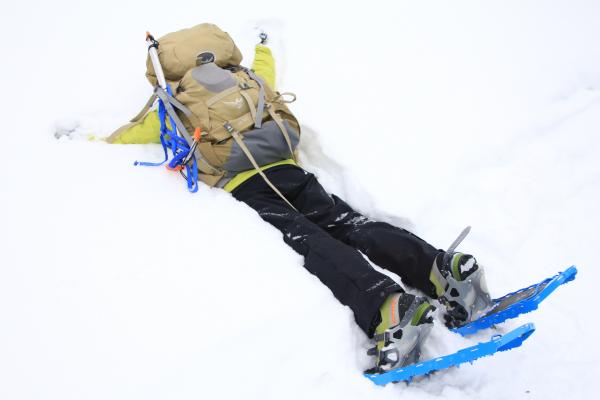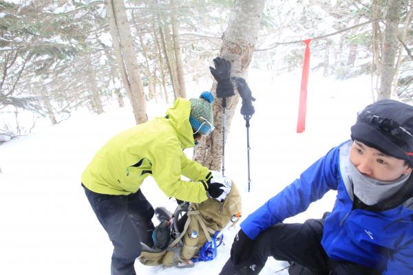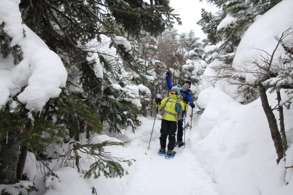登りはスノーシューで問題ありませんが、下山時に表コースは急坂が多く、スノーシューを使い慣れていない場合は