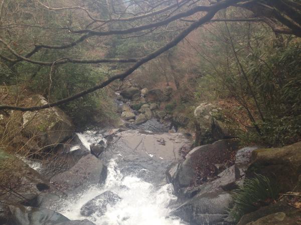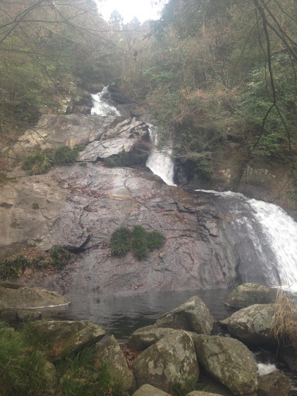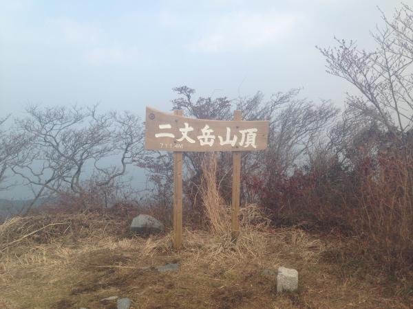 今日は午後から用事があったのでゆらりんこ橋からのピストンです。駐車場での気温は6℃。スタートはドライレイヤー+夏のジップアップロングスリーブ+毛足の長いフリース+レインウェアにネックウォーマー、ニット帽、フリース手袋と完全防備(笑)最初は二条渓谷遊歩道を進みます。きちんと整備されていて歩きやすいです。ゆるやかな登りを10分も歩くと暑くなってきて、レインウェアを脱ぎ、ネックウォーマーにはたまたグローブまで外しました。加茂川の流れを楽しみながらしばらく行くと見事な滝に。この滝、先に進むと上からも見ることができるんです(足元注意)。間もなく加茂神社へ。林道を貯水池をまわるように進むと左に二条岳登山口が現れます。行きすぎないように注意してください(笑)ここからだんだんと登りがきつくなり、二条森林公園からの登山道と合流地点からさらに息が上がる登りです。頂上直下ではロープまで現れ、ゼイゼイハアハア一気に登るとそこは大展望の山頂!!!と思いきやほとんど霞んでいて大展望かなわず(泣)もしやPM2.5か?!