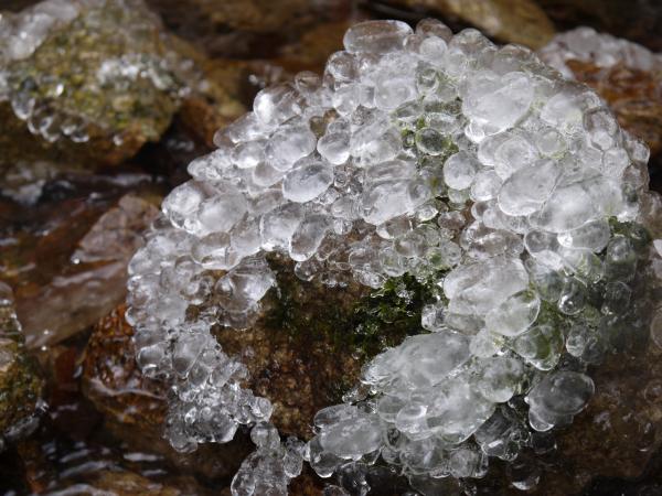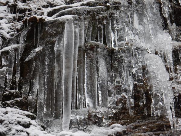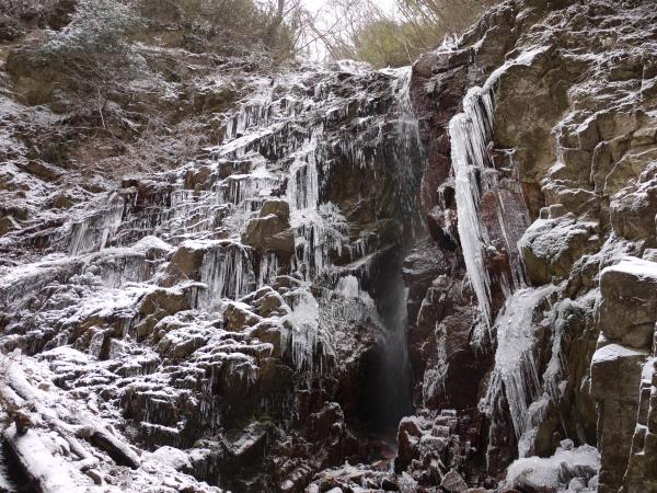 七曲の滝は7割程度の氷結具合。百間滝、似位滝は2割程度といったところですが、滝の飛沫が氷柱をつくり岩肌や木の枝が不思議で美しい自然の造形を見せています。