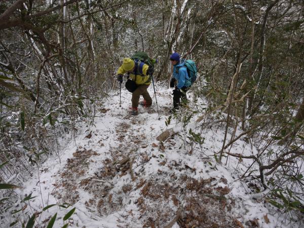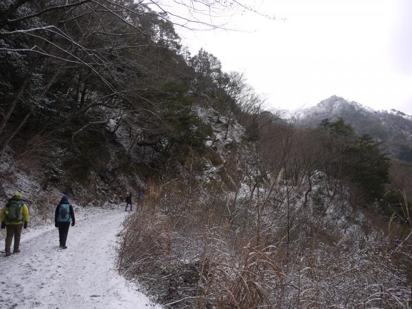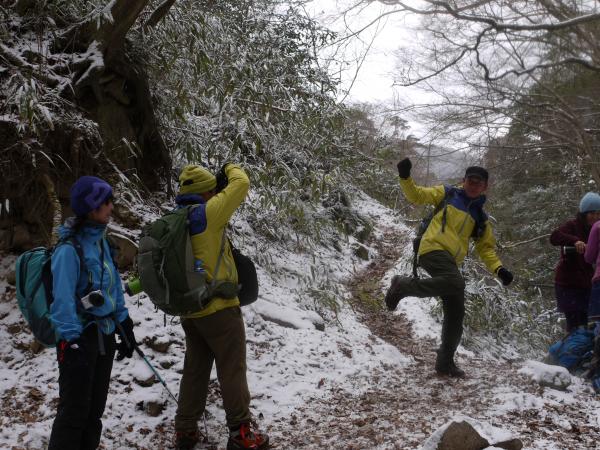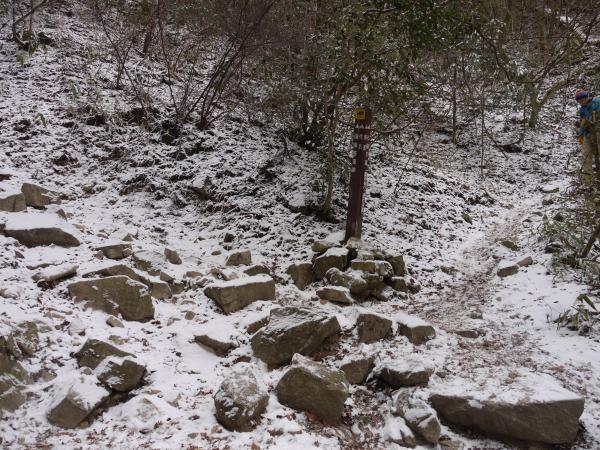 ロープウエイ有馬温泉駅周辺の路面は真っ白です、滑りやすいので歩幅を小さくゆっくり歩きます。15分ほど歩いたところで軽アイゼンを装着です。6本爪のアイゼンはあまり斜度のきつくない日陰の低山で重宝します。