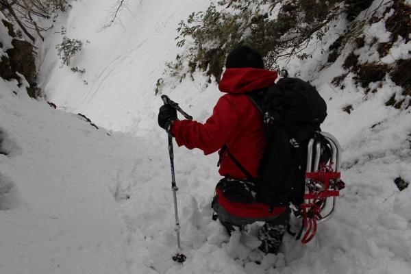 下りで歩いた長石谷は雪が多く、沢を歩くので、石が多く、歩きにくいです。