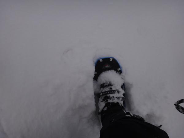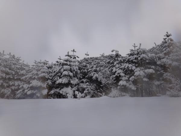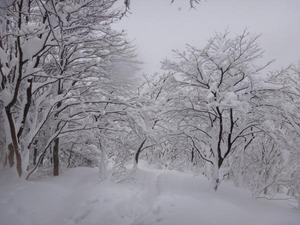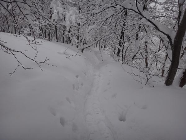 雪曇りの中白い森の中へ分け入ると様々な動物の足跡が。これは兎かななどと想像しながら歩くのも楽しいものです。どんぐりの森から傾斜がきつくなったので、この時点でスノーシューを装着しました。リフトアップのおかげでさくさく登れます。しかし進むにつれ吹雪いてきてしまい視界不良、七合目に入ると完全に道が埋まっていました。果敢にラッセルに挑戦するも敢無く敗退。ここで引き返す事に。