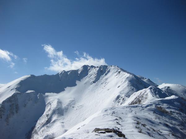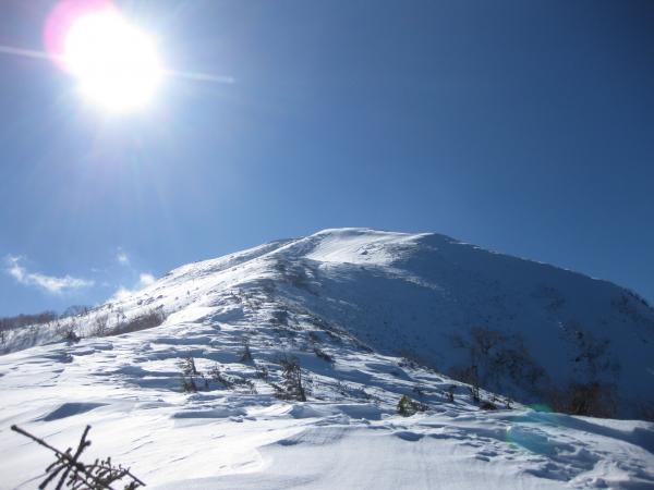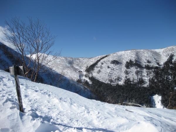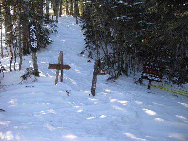 翌朝、少し寝坊して夜明けごろの出発。トレースはないのですが、夏道通しなので迷うことはまずありません。つぼ足で足首〜膝下くらいの積雪。時々道を外して膝上まではまりますがまずまずの時間で大滝の頭に到着。ここから稜線に出るまでのラッセル!ワカンを着けて腰まで潜るのを気合いで突破!