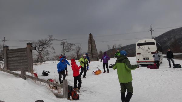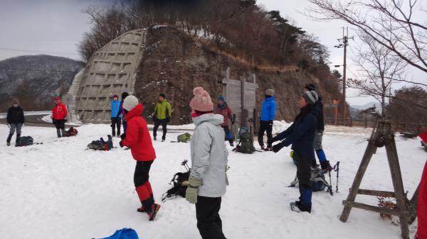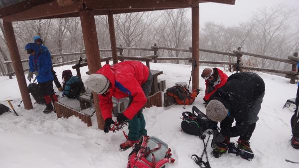アイゼンの装着方法、アイゼン歩行、雪山装備の選び方、雪山の注意点等、雪山の基礎を学びました。