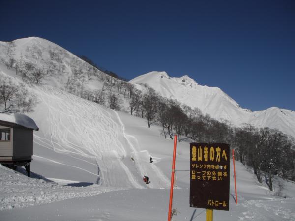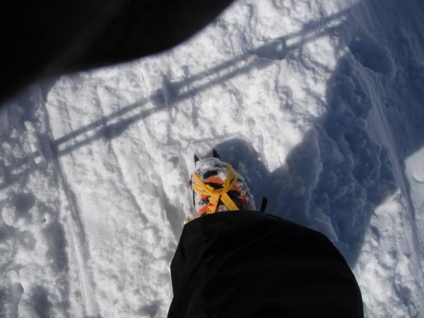 ロープウェイで天神平に着き、ワカンを装着していると皆さんスノーシューを履いてます。MSR率高し!ワカンは浮力では劣りますが、機動力は上だと思います。特に下りでスノーシューだと横向きに降りなければならない所でもガシガシ下る事が出来ました。