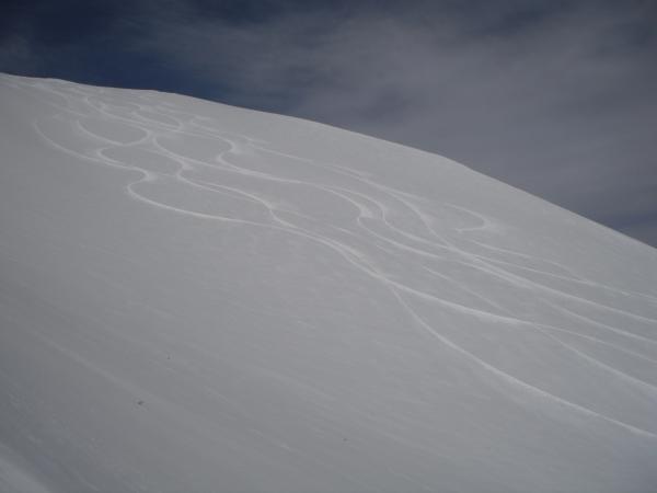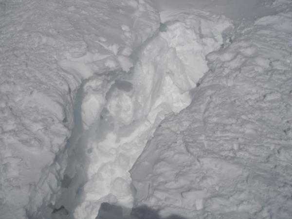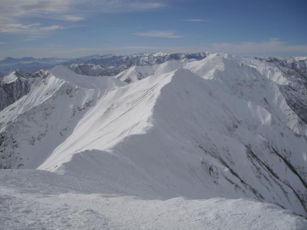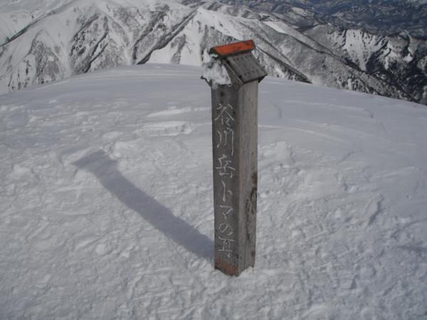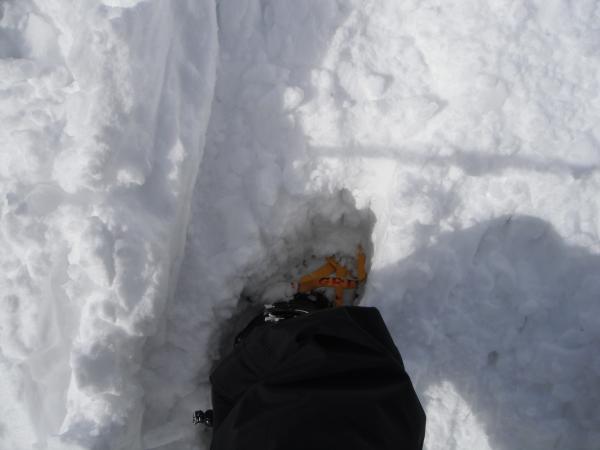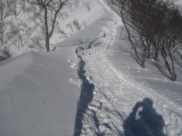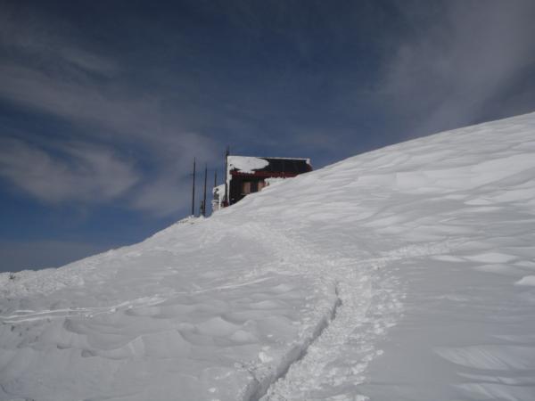 トラバースやアップダウンを繰り返して行くと、やや雪がしまってきたような気がしたので、アイゼンに履き替えるととたんにズブリ!そのうち固くなるだろうと登って行きましたが、とうとう肩の小屋まで来てしまい、アイゼンが有効だなと思ったのはトマの耳辺りだけでした。おかげでくたびれてしまったのでオキの耳はお預け。とほほ。