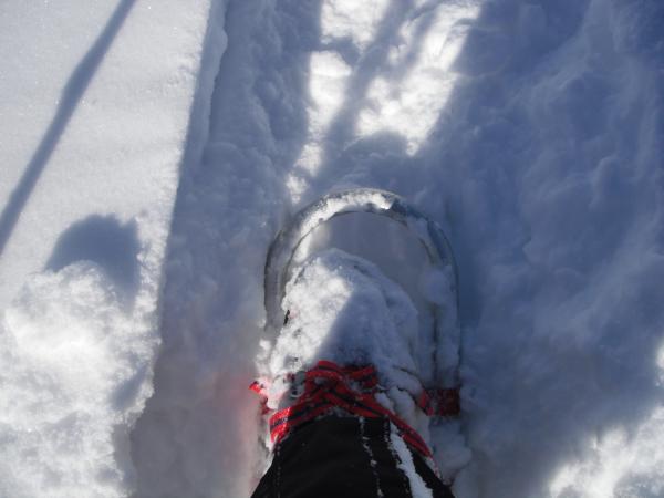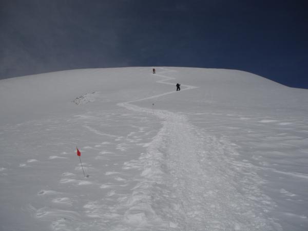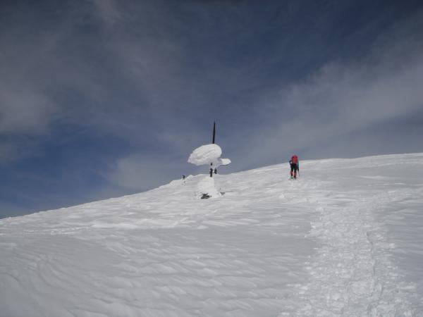 - 前日まで降雪があったため、ラッセルが心配でしたが大勢の方がスノーシューで登ったため、トレースばっちり!ほとんど苦労しませんでした。今回はワカンを使用しましたが、ザンゲ岩辺りから雪がしまって来たように感じたため、アイゼンに履き替えた所、膝まで潜る所が多く大変でした。ワカンに戻せばいいものを無精したため消耗してしまいました。