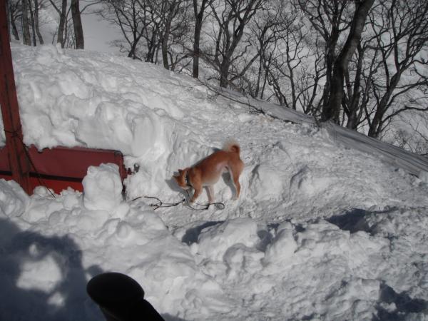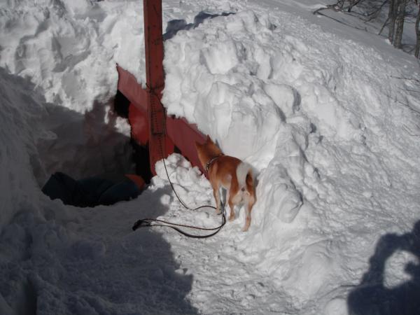 熊穴沢避難小屋はこの時期は目印の柱が出ているだけの事が多いのですが、どなたか泊まられたらしく、入り口が除雪されていました。そしてなぜか柴犬に遭遇。あまりのかわいさにカメラを向けると