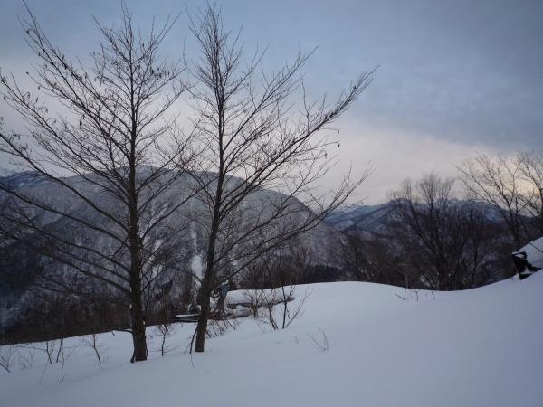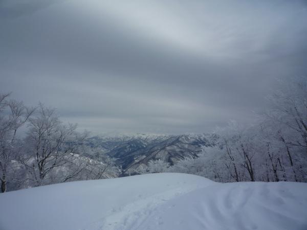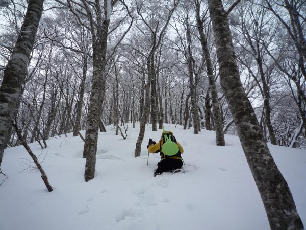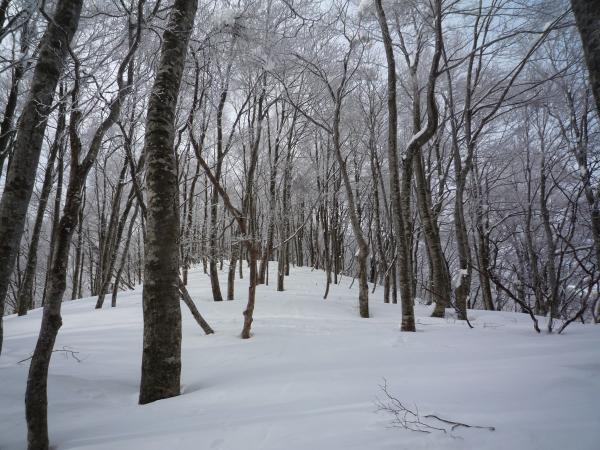 前日までの降雪でラッセル祭りを想定したがそこまではなく、雪は締まっていた。終始膝下まで。それでも、スキーヤーのトレースを利用しながら、なるべく体力の消耗を抑えつつ前進。