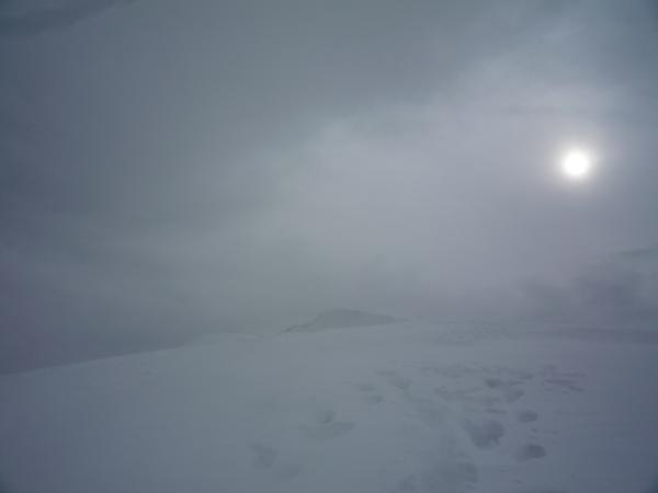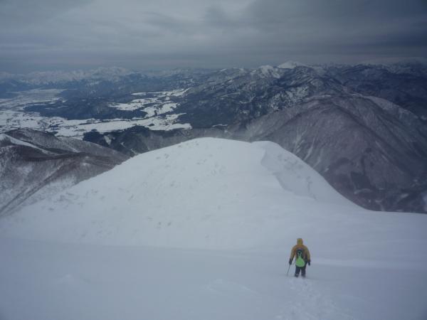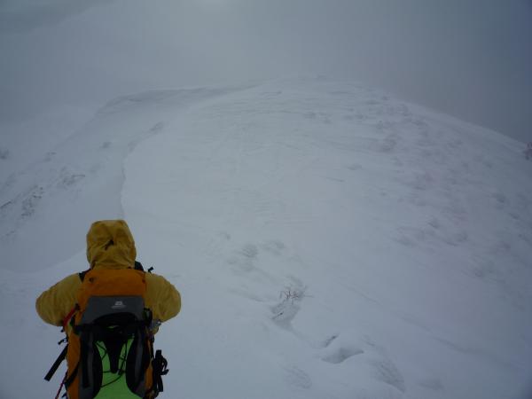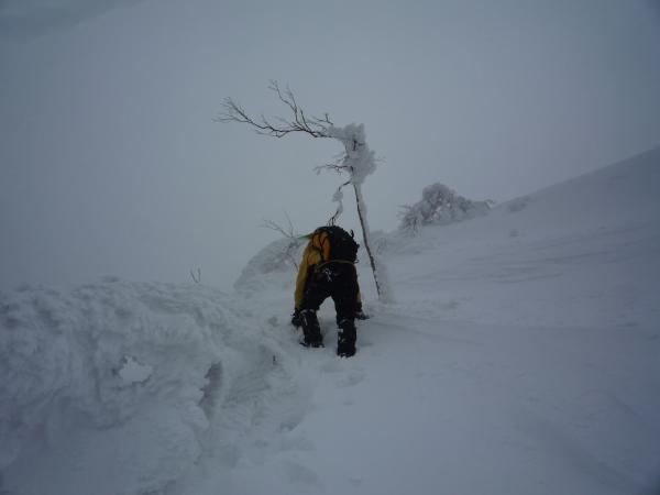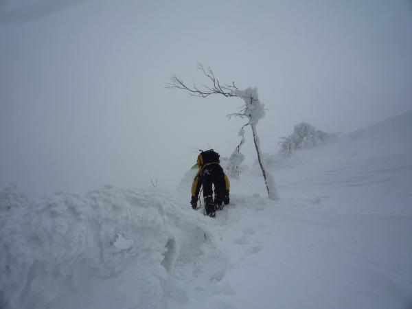 もちがかべ手前でワカンとスノーシューをデポし、アイゼンとピッケルで前進。樹林帯を抜け尾根歩きのため、横風との戦いです。ゴーグルとジャケットのフードでしっかり暴風対策を。東側に出来る雪庇に注意しながら、なるべく西側の木のある方を歩きます。たまに木に足を取られ踏み抜きがあるので注意してください。