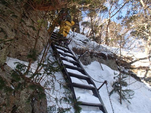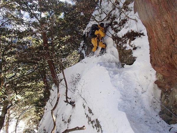 日本岳のコル以降ははしごはステップの間が雪に埋まっていたり、急斜面の上り下りやトラバース、リッジの通過などアイゼンとピッケルをフル活用しての行動となります。