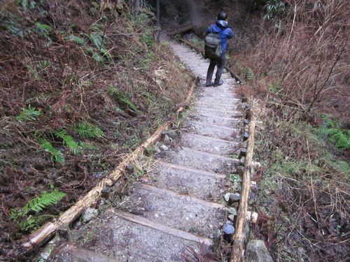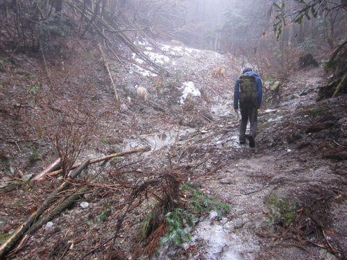 山頂に近づくと溶けて氷った場所が多くタカハタ道はそこそこ急な登山道なのでアイゼンを付けて登らないと危険でした。