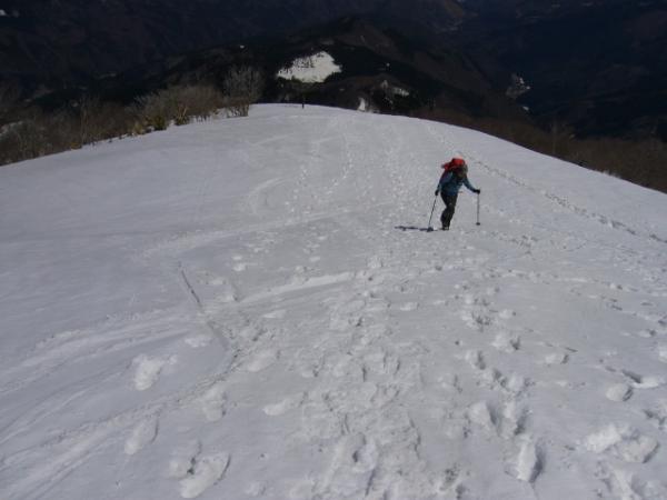 一の谷からはクラストした雪に変わり、前爪付きのアイゼンが必要です。