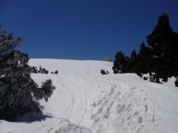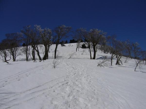 山頂直下の雪は硬く締まっており、アイゼンのみで登れます。