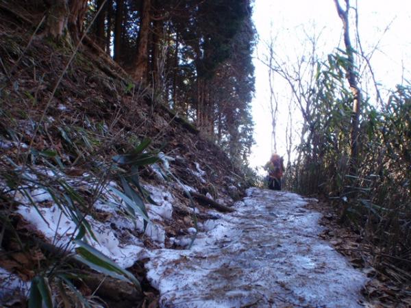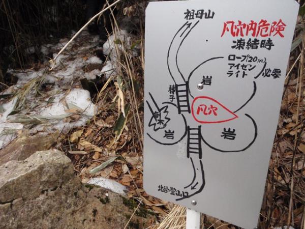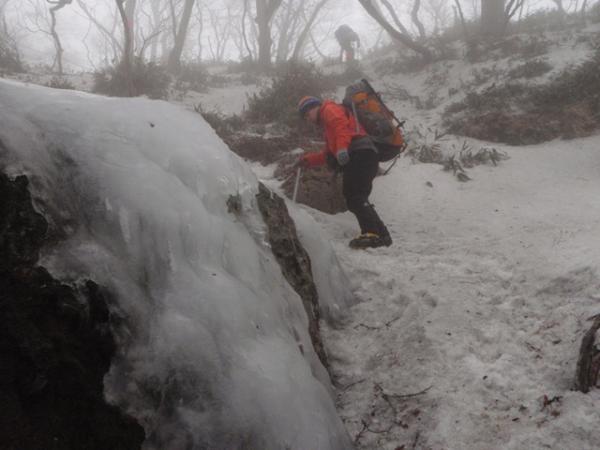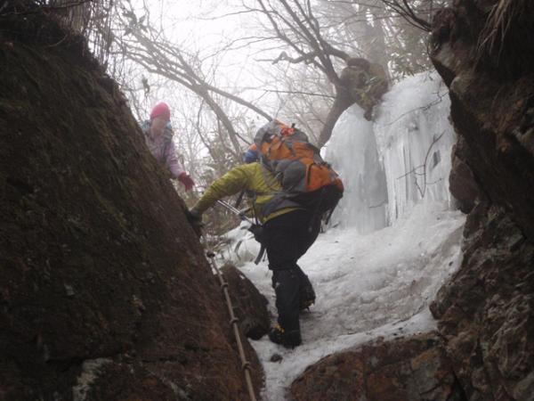 北谷登山口~風穴経由コースは、風穴の先辺りから、アイゼンが必要です。途中、ガチガチに凍っている所、横がスッパリ切れているところがありますので、10、12本爪アイゼン、またピッケルの装備が必要です。冬は、しっかりとした装備が必要で、健脚コースです。