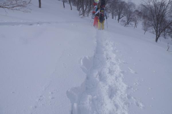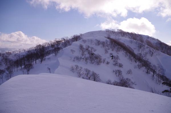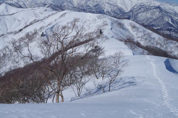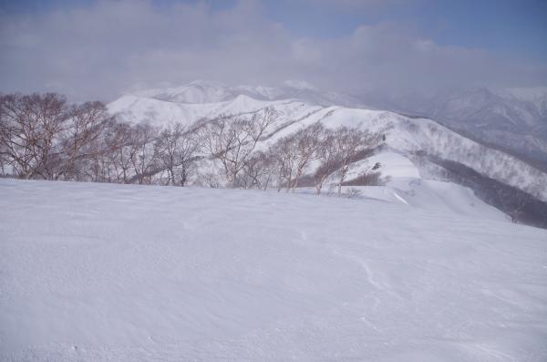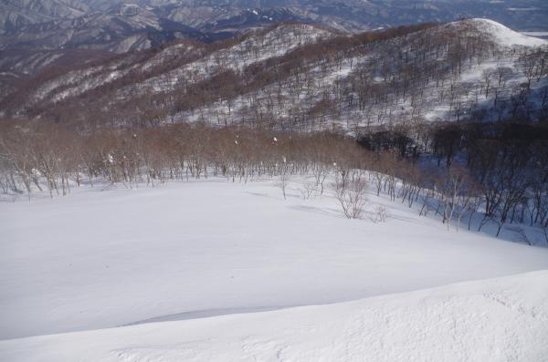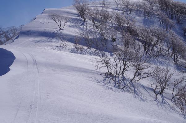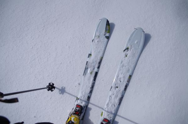 新雪狙いで、ファットスキーで行きましたが、稜線はガリガリのアイスバーンでしたが、谷にドロップするとフカフカなパウダーでした