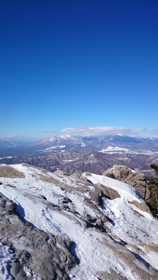 山頂に立ち、金峰・南アルプス・小川山・富士山・八ヶ岳が見渡せる展望。