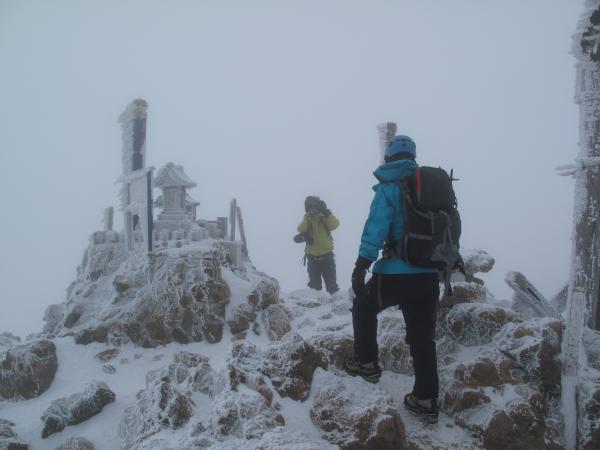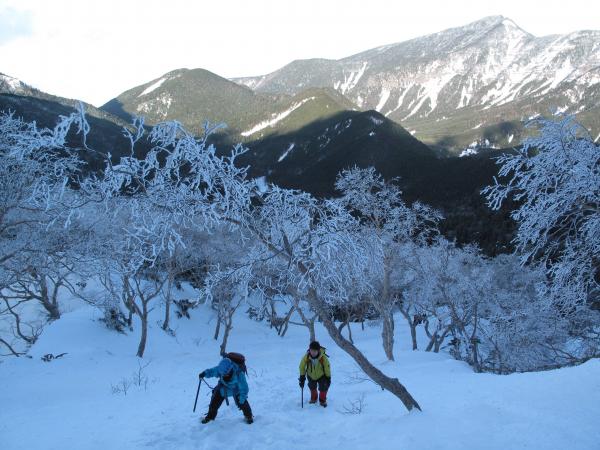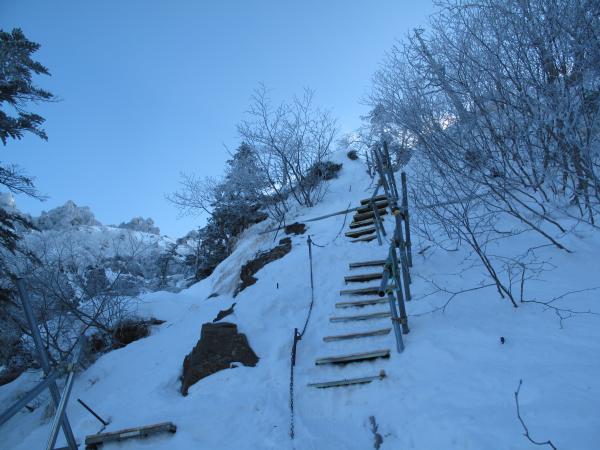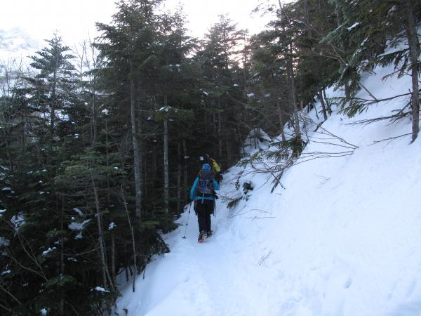 行者小屋から地蔵尾根に取り付きます。雪が良い具合に締まってたので、アイゼンがサクサク刺さりました。