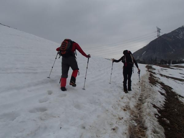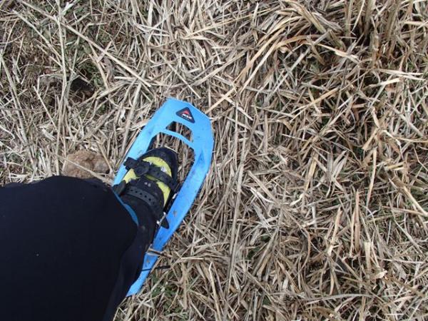 雪はグサグサで、そっと体重をかけないとズボズボ埋まります。