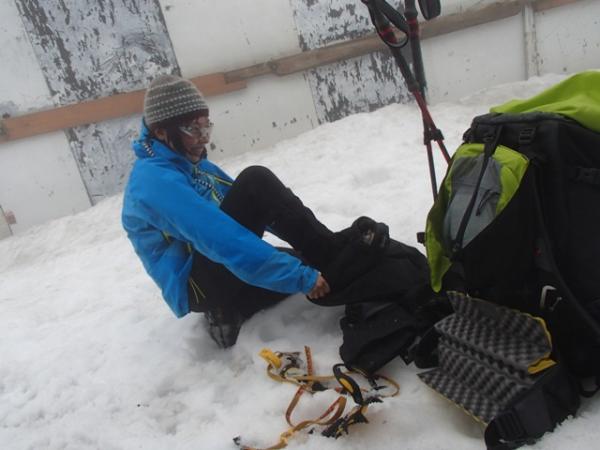 急斜面なので前爪のある10本爪以上のアイゼンが必要です。