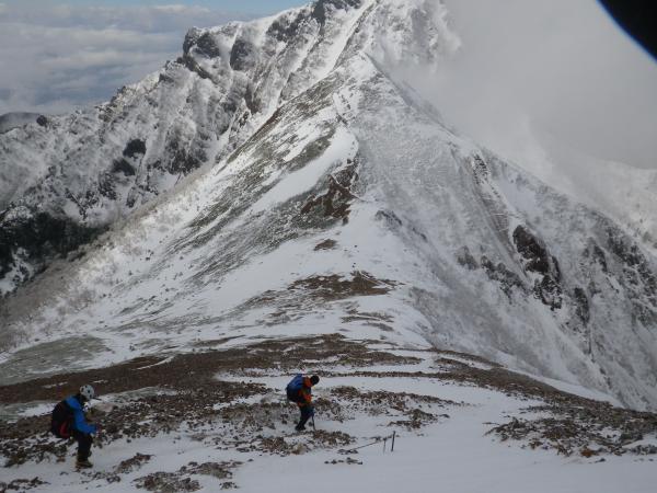 - トレースがしっかりついていて、締った雪。ワカンは不要です。10~12本爪アイゼン、ピッケルが必要です。中岳方面はトレースのない部分がありあます。雪庇状になった部分もあります。中岳沢は降雪直後などは注意が必要です。