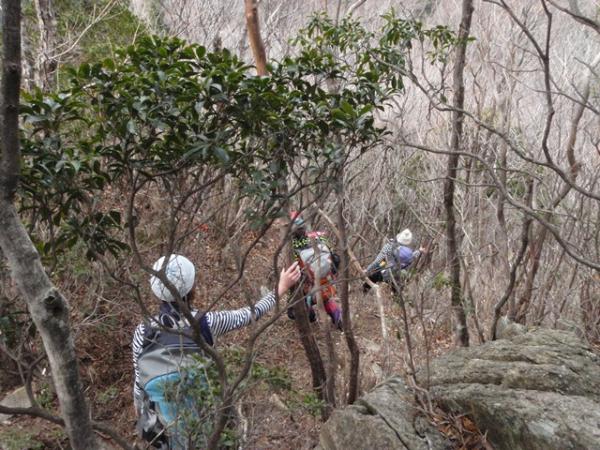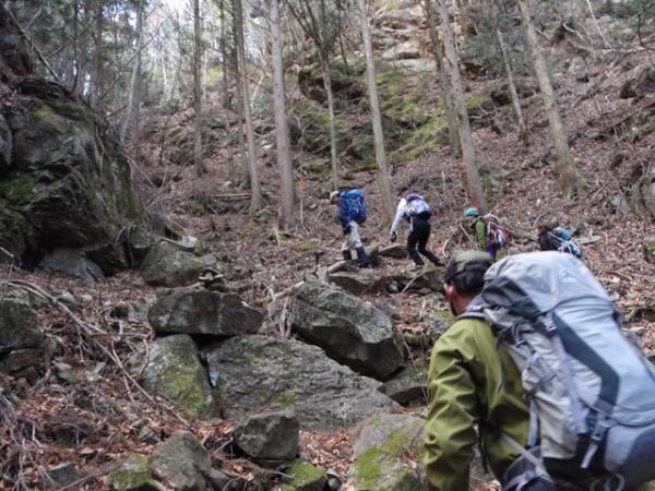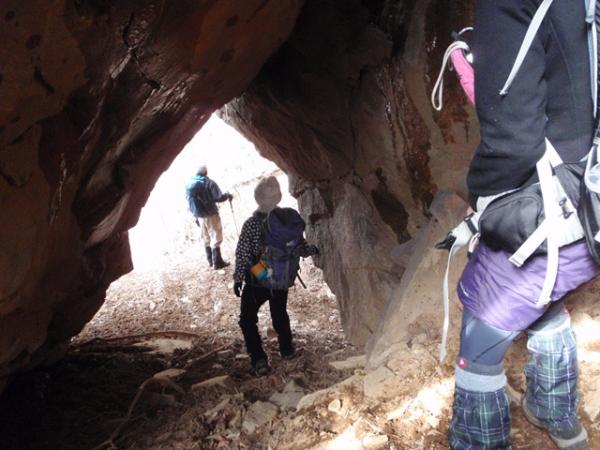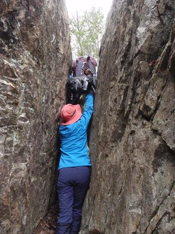 越敷岳から下山に使うルートの途中にあるハサミ岩は、ザックを背負っては通れないくらい狭いです。ザックを先に通して、体を後から通さなければ通過できない所でした。大変ですが、協力しながら通過できて面白かったです。