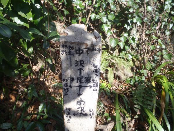 南中峠を過ぎ、細い尾根道をたどって沢に下りると森戸林道終点に出ます。