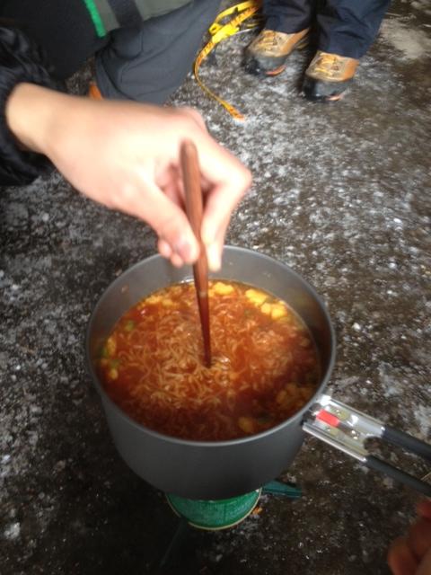 山頂でトマトラーメンと胡麻つくね鍋を仲間に作ってもらい食べました。