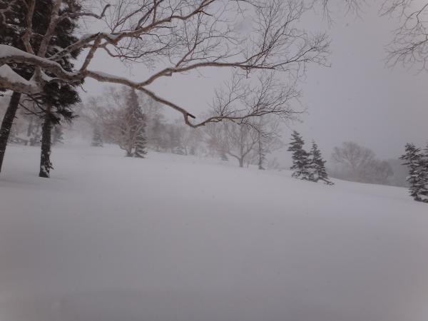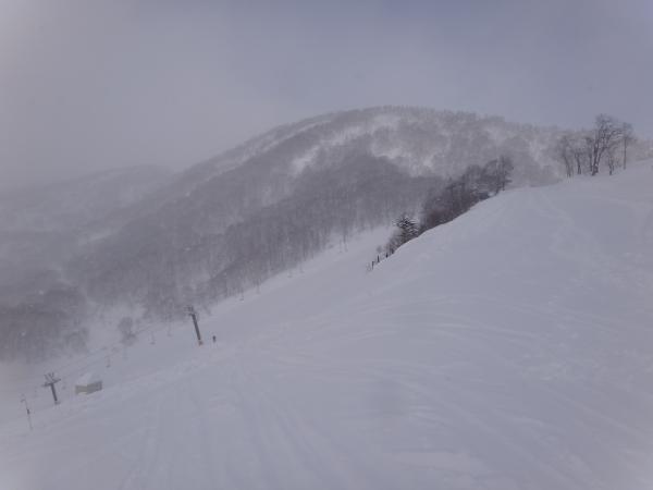 ゲレンデトップはガスっているが山は確認できる。雪のコンディションは軽い新雪でテンションが上がる。