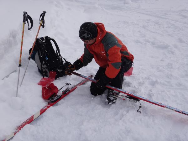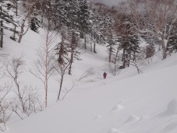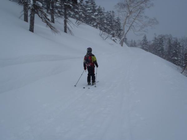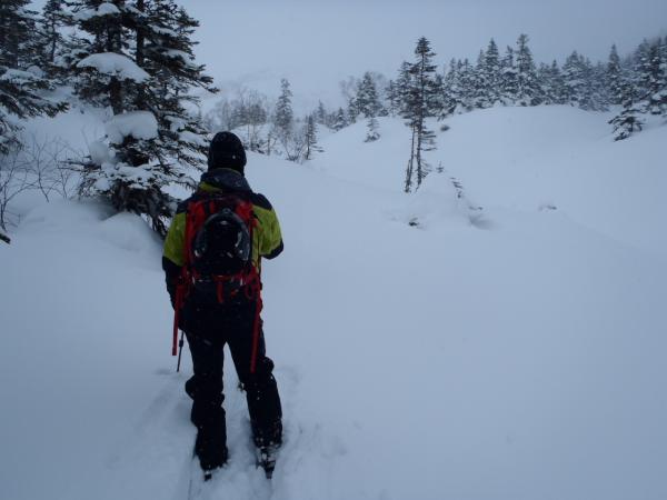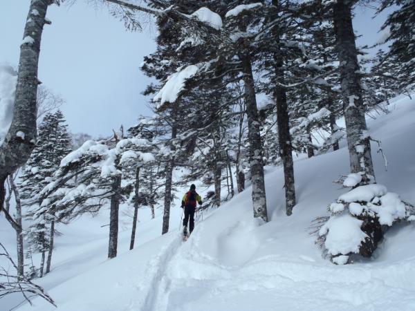 雪面には数日前に付けられた僅かなトレースラインが確認できる。GPSで現在地と進む方向を確認して慎重に奥へと進む。トレースが消えてからはスキーラッセルで進むが膝下近くのラッセルは歩行速度を鈍らせる。