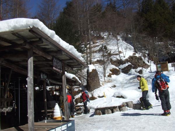 美濃戸山荘までは道路が凍っているところが多かったため、最初からアイゼンを装着した方が楽に登れました。また二日目行者小屋から南沢を通りましたが、こちらも凍っている箇所がありました。アイゼンを装着した方が安全です。