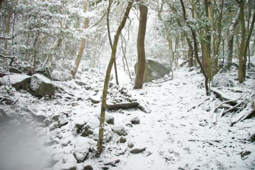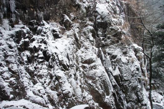- 河原谷入り口からうさぎ道分岐くらいまでほとんど雪はありませんでしたが、それ以降は足元の岩が隠れるくらいの積雪でした。仏頂山から難所ヶ滝への急な下りはかなり滑りました。