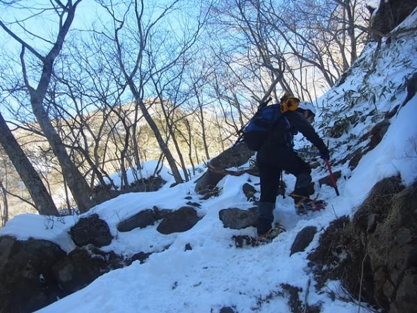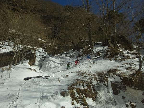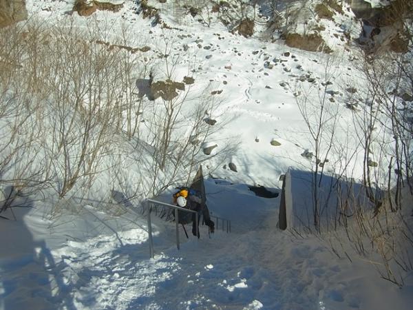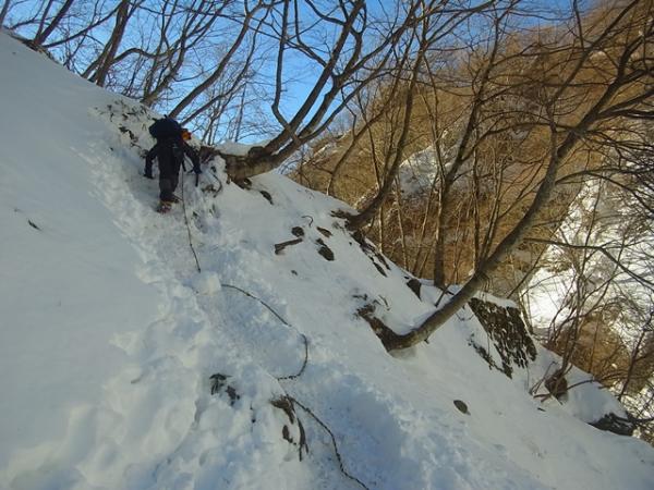 ☆雲竜瀑高巻き トレースはなかった。雪のつき具合が悪く薄かったり、膝上の積雪だったり。アイゼンとアックスを使っての登りとなり初心者は不可。慣れた方でも注意されたし。