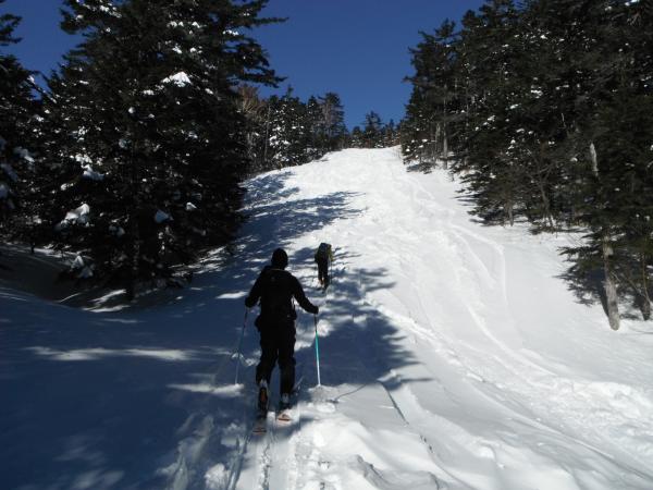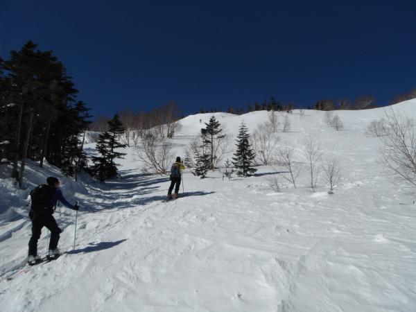 アイゼンは持ってきていなかったので肩ノ小屋で登高終了、摩利支天東面を滑りました。