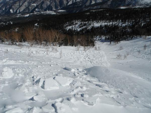 分岐右手斜面雪崩(昨日か一昨日?)の跡あり。