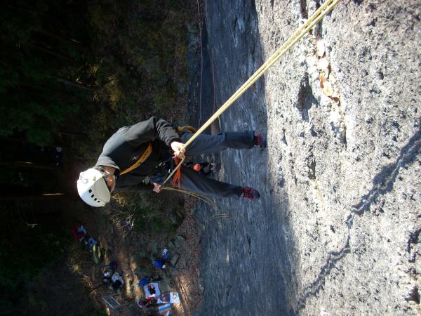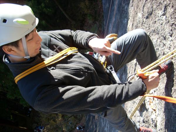 弁天岩の慣れた易しいルートを交代でリードしながらビレーの練習を
