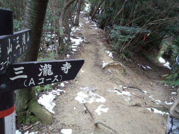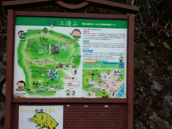 - 三滝駅(15分)三滝参道入り口・Bコース(10分)鞍部(10分)双子の大岩(20分)宋箇山山頂・Aコース(15分)奥畑方面分岐(10分)三滝寺への分岐(20分)三滝参道入り口(10分)三滝駅