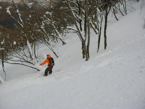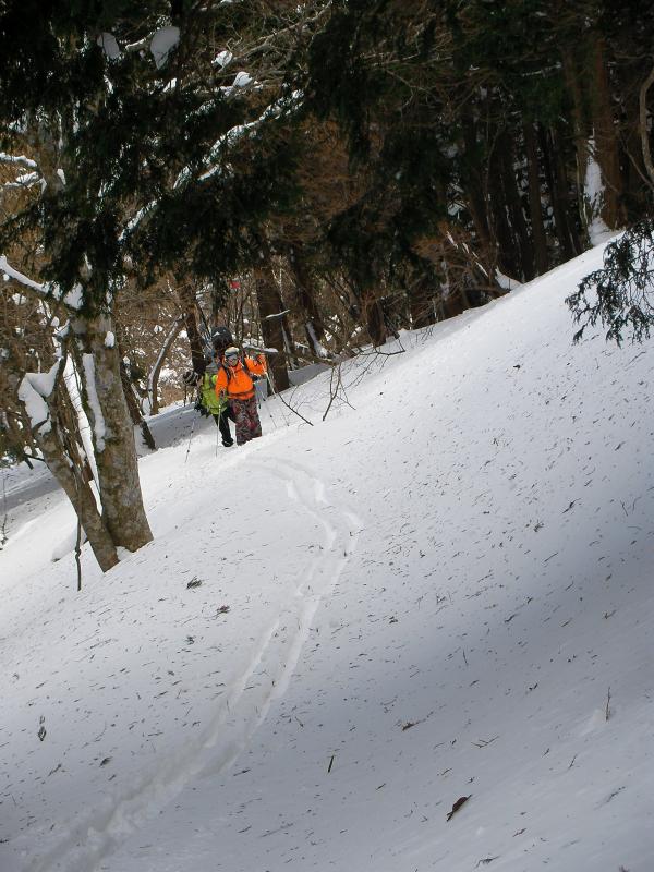 - 積雪は朽木スキー場発表で80㎝でした。尾根は風が強く、雪面も硬めでした。樹林帯の中は比較的、雪も柔らかく滑走しやすかったです。
