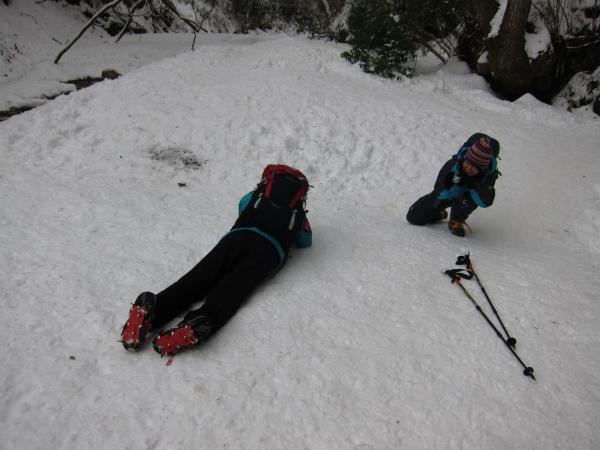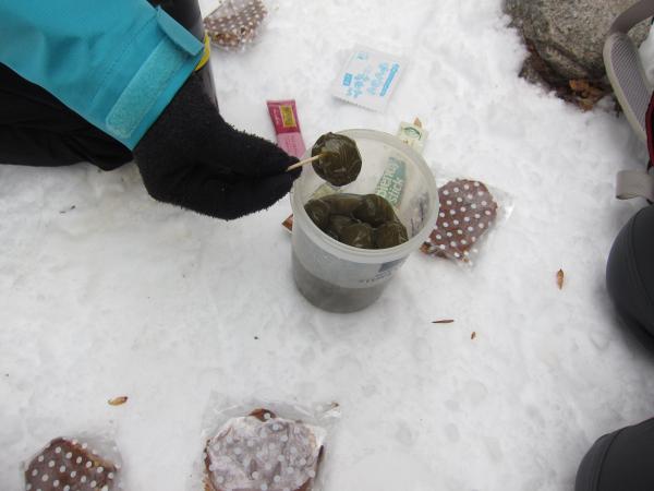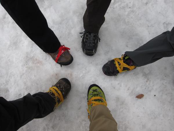 今回はこの冬購入した厳冬期用登山靴「モンブラン」の履き慣らしも兼ねていました。メンバーにはローカットシューズの先輩もいらっしゃる中、オーバースペック気味なわたしの足元…。でも6本爪アイゼンもきちっと装着できた(靴サイズが小さいからかもしれません)ので、問題ナシです!