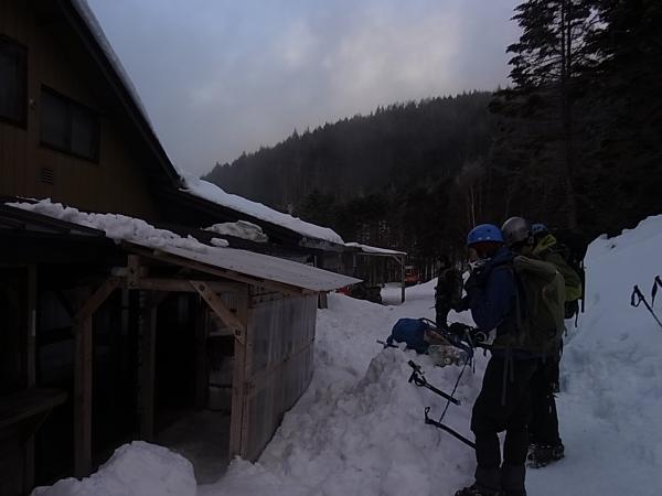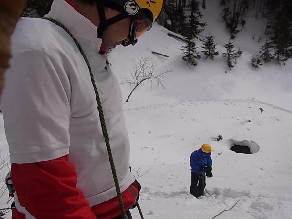 入山日は素晴らしい天気に恵まれました。ジョーゴ沢F2手前の右岸でロープを使ったビレイの練習をしました。ここは雪がやわらかくビレイ役より滑落役のほうが大変でした。
