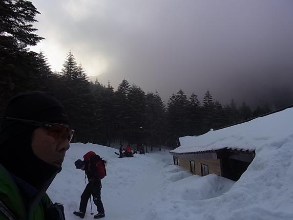 夜たっぷりと親睦を深めた翌日、意外にも登れそうな天気。順調に登って頂上に着くとちょうど晴れ間が現れました。帰路はゆっくり慎重に降りました。樹林に入ってからはシリセードも楽しみました。