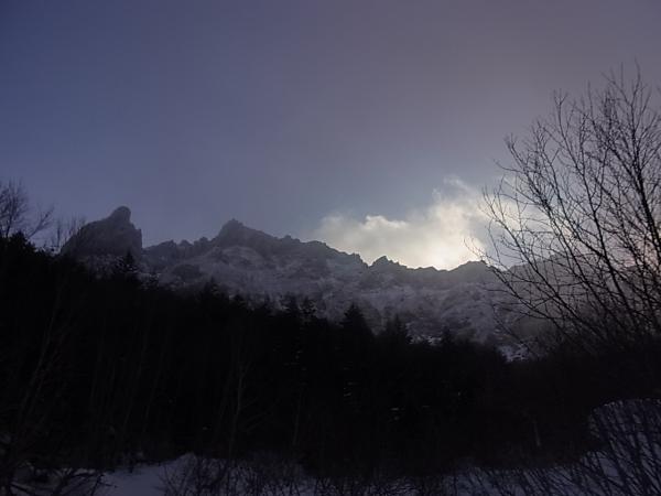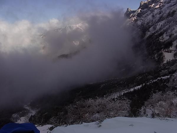 - 前線通過と冬型の境目の時間帯でした。風弱く、気温も高め。道は踏まれておりラッセルはなし。稜線近くから気分の出る冬の景色を楽しみました。